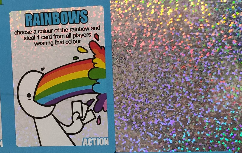 It could be told from the photo, the right side is shinier than the left one. And after we apply white ink, a different percentage to different parts of the cards. The most obvious difference is the rainbow part and the character, the character part use 100%, then you cant see any rainbow.